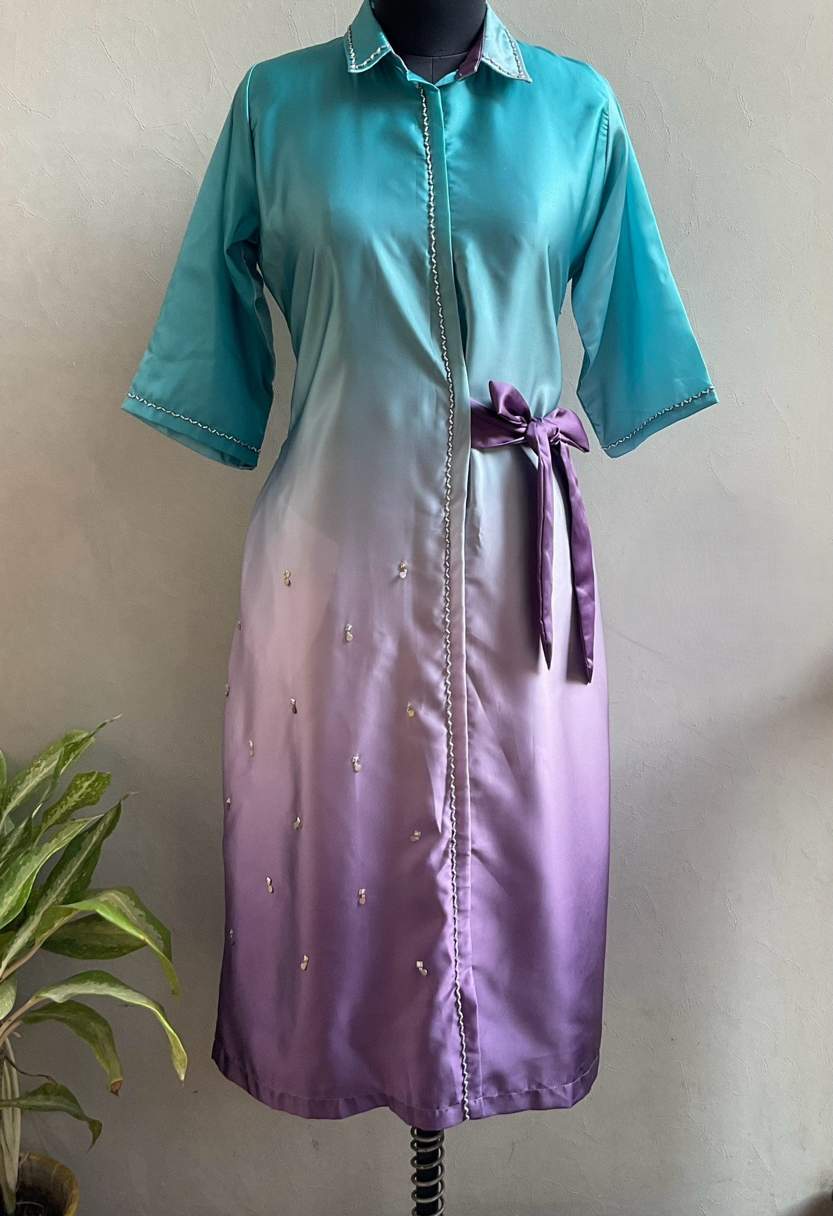 SEA BLUE OMBRE SHADE CUTDANA EMBROIDERED ALINE DRESS
